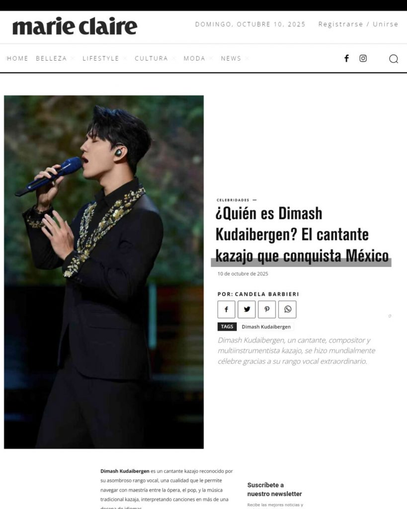 Dans sa rubrique « Célébrités », Marie Claire México a posé la question suivante, avant d’y répondre : « Qui est Dimash Qudaibergen ? Le chanteur kazakh qui conquiert le Mexique. »
